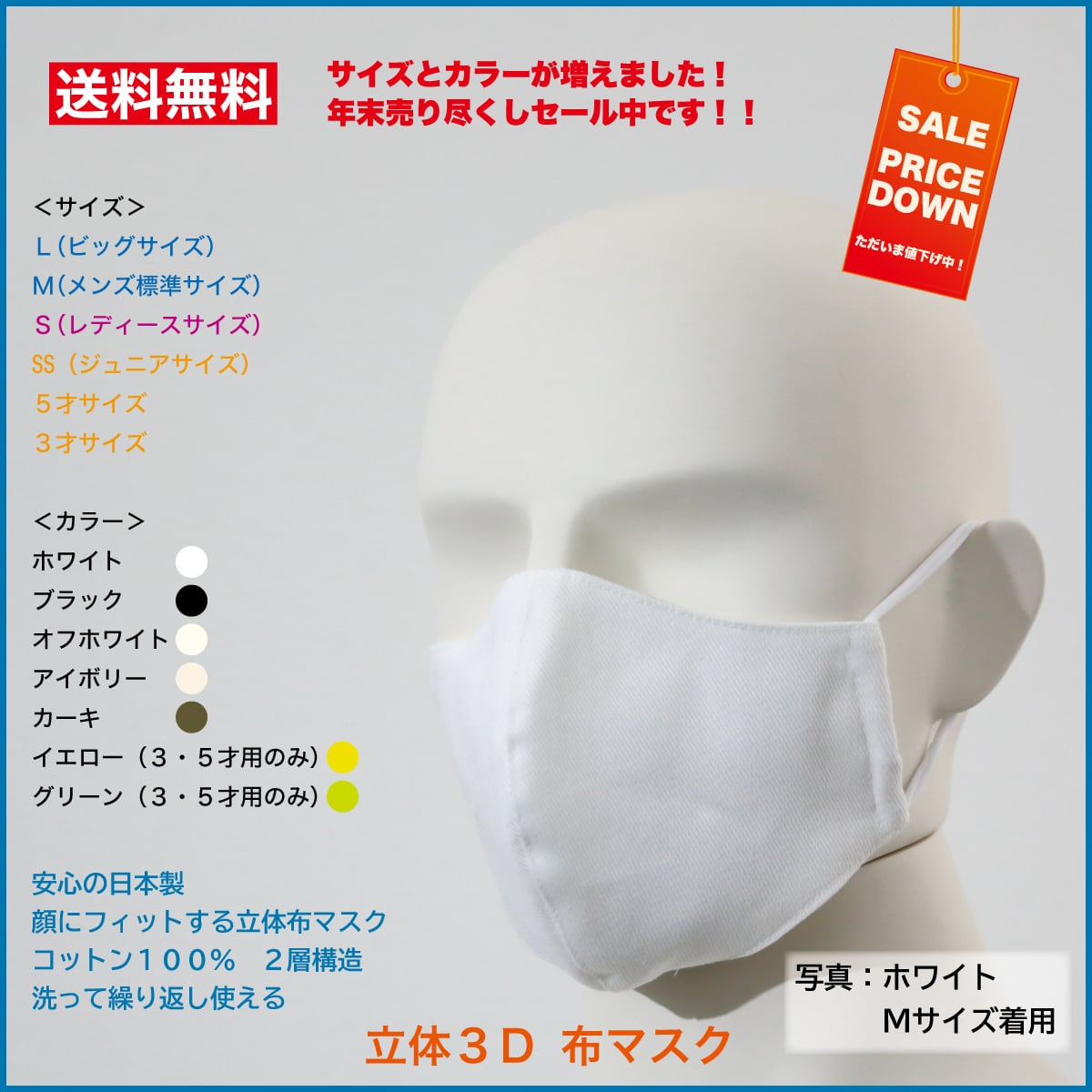 【在庫売り尽くしセール】布マスク 立体 3D 洗える コットン100% ウイルス 飛沫防止 耳紐調整可能 日本製 サイズL・M・S・SS・5才・3才 送料無料