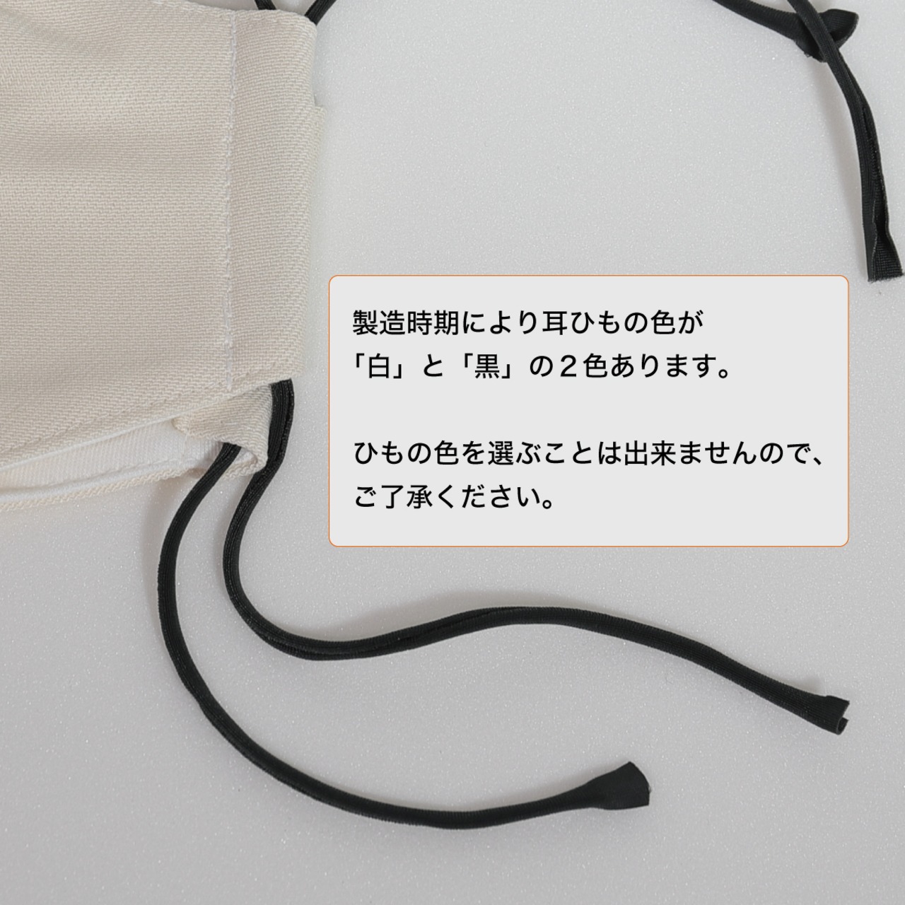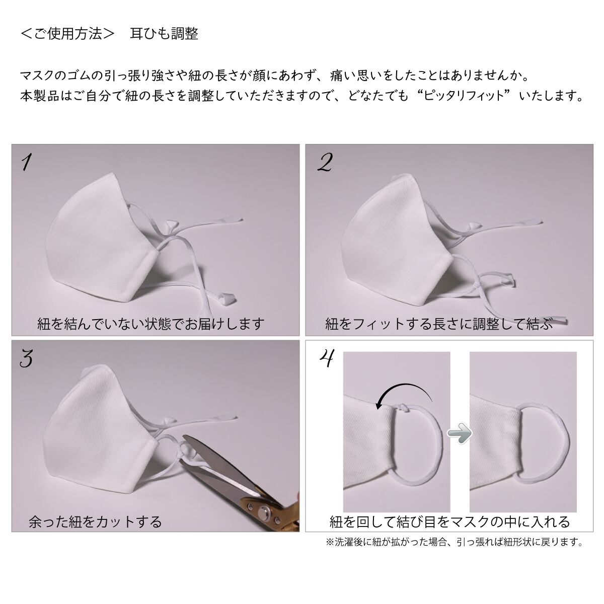 マスクのひもは結ばない状態でお届けします。フィットする長さに調整し、結び目をマスクの中にしまってお使いください。
